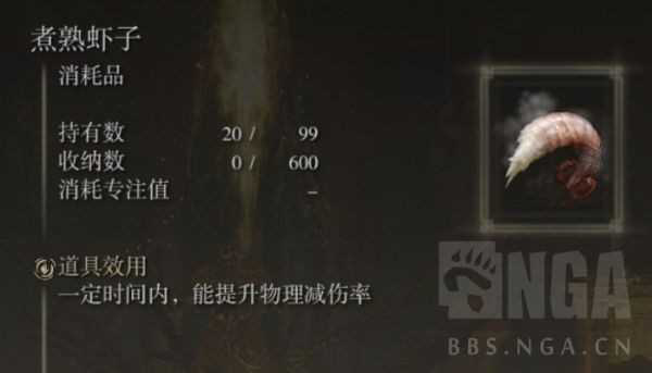 提高物理减伤率,去哪都能用的到,而且它们的价格是600卢恩/个,性价比极高,我每次都会买不少,打硬茬子的时候先啃口螃蟹肉总没错。