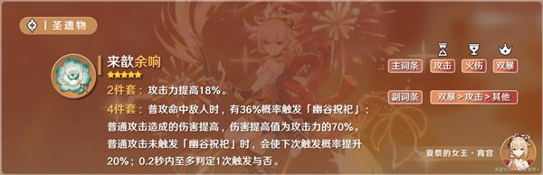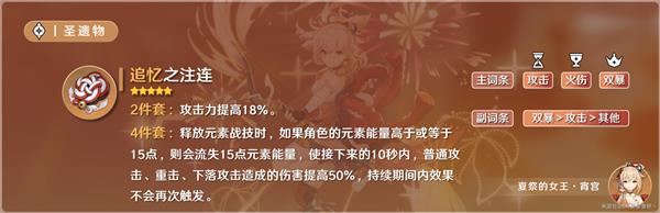 除此之外,圣遗物4件套属性非常契合宵宫的还有「来歆余响」。