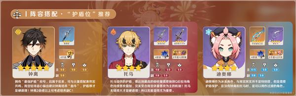 其实总结下来阵容搭配的套路都是一样,先解决队伍的续航(护盾/治疗),然后搭配合适的增伤辅助,缺攻击给能提供攻击的辅助,缺元素伤害给能提供伤害加成的辅助,再来个功能性的副C就完事了。
