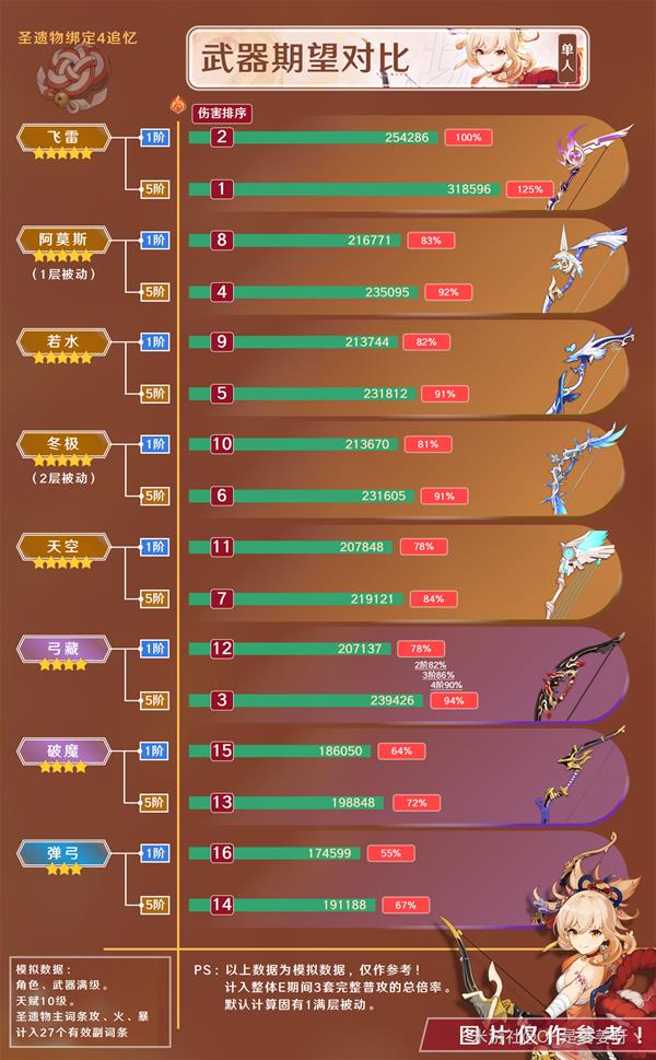由上图可以看出,最佳武器自然是飞雷之弦振,不管几阶都是最佳适配。除此之外,四星武器弓藏,在3阶或以上就已超越了除飞雷外的5星1阶武器,即使1阶的弓藏与除飞雷外的1阶5星武器的差距也并不大。所以建议武器选择优先飞雷,其次弓藏即可。其余武器若携带4追忆时可按图上伤害顺序依次选择即可。