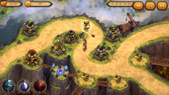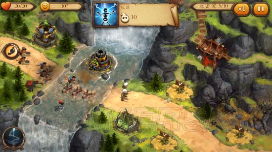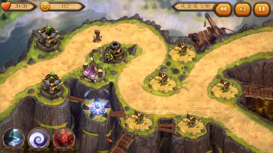 在排除了英雄这个要素之后,本作跟一些其他的塔防游戏其实是大同小异的。令人觉得颇有趣味的就是游戏不同的关卡之中的地形特征。例如第一关的河流会很大程度上减缓敌人的速度,第三关可以利用地图上的装置发动技能——当然你得支付一定的费用。这些因素让人对新关卡的期待值可以说是大幅度增加了。