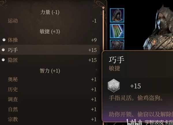 这里就很明确显示了各种加成的来源:3+6+6 = 15 (巧手)