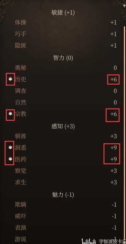 而因为智力只有10点,所以 历史、宗教 只吃到熟练项加成