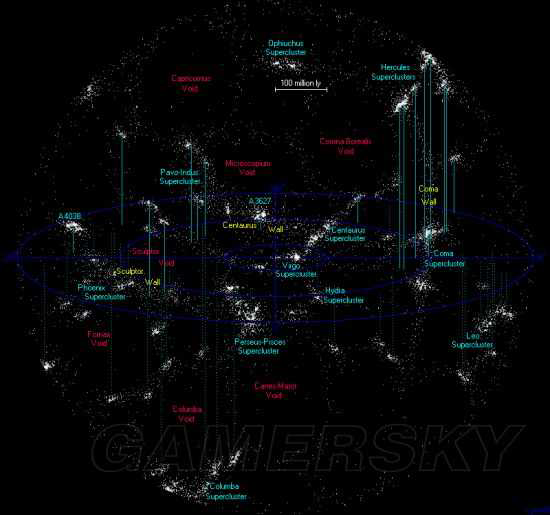 整个宇宙中,星系的存在一些很明显的分布规律,形成一些特殊的结构。这种结构,我们称其为纤维(filament)或大尺度丝状结构(galaxy filament),又或者超星系团复合体(supercluster complexes)或星系长城(great walls),从这些名字,我们可以大约猜出它的结构,它是由无数星系、星系团和超星系团组成的巨大的纤维状结构。