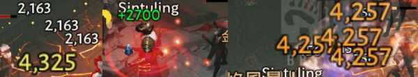 橙色:强烈伤害(受到技能特效的加成比如法师的奥义旋风在怪物被点燃时会有50%额外伤害加成,这个数字就是橙色的),且享受暴击伤害加成(目前有BUG,部分情况暴击伤害显示的是橙色字体);