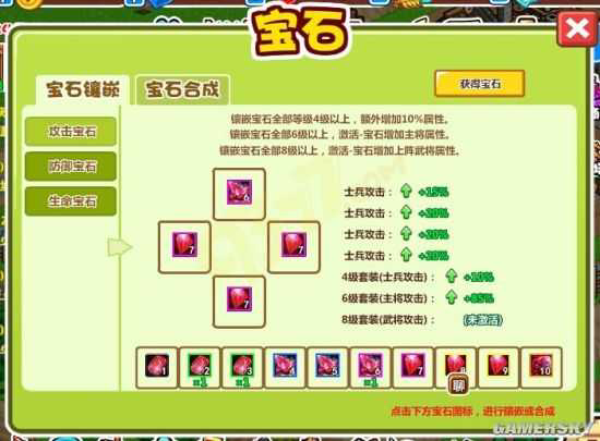 玩家平时可结合宝石品质和宝石等级,来挑选一些品质较好、级别较高的宝石镶嵌,如此能快速你的士兵实力,为了你开疆扩土打下坚实的基础。或者玩家收集到一些低品质的宝石,你也能通过宝石合成功能,将低品质的宝石转换为高品质的宝石。