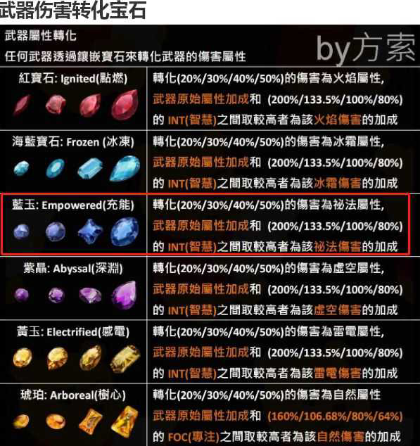 秘法伤害可以用充能宝石把主属性80%的属性增伤改为秘法伤害,镶嵌在武器上即可
