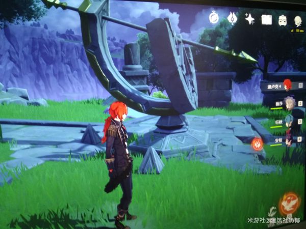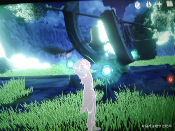 这里有个碎石,敲烂后进入下一环,把时间调到2点,开元素视野(鼠标中键按住)可以看到四个小黑球,位置如下,用主角的风元素打爆四个小球(需要在元素视野开着的时候,如下)