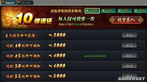 等级投资分为1000元宝、2000元宝、5000元宝、10000元宝4个等级,只有等级小于65级的玩家才可参与投资,每人仅可投资一次,投资返还的绑定元宝会分12次返还给大家,玩家达到对应的等级即可领取返还的绑定元宝。