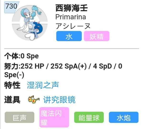 我日月选的御三家所以很有感情,目前没有卡璞琪琪等前代强力水仙,作为目前唯一水仙可以担任小卡璞琪琪使用,有能量球不怕海兔,带水炮是为了确1抄家或者有时候被迫极巨化,平时巨声仙闪看情况选择就好,巨声面对大部分精灵都能过半,0速实际速度58,不知道空间下能过谁,但是感觉60好像蛮关键的
