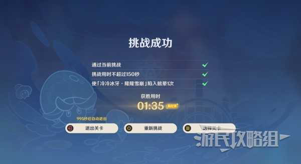通过当前挑战;挑战用时不超过150秒;使「冷冷冰牙·隆隆雪崩」陷入眩晕1次