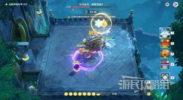 注意本关的目标需要让对手陷入眩晕1次,所以可以考虑选择带有护盾的蕈兽上场,或者抓住时机拾取击败场上的小雪猪掉落的寒冷祝福来获得护盾,在有护盾的状态下应对对手的冲撞即可使其眩晕。