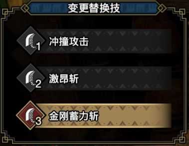 【冲撞攻击】好说,【激昂斩】和【金刚蓄力斩】都是典型的用血换输出的替换技,所以防御可以稍微缓和血线压力。
