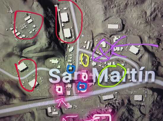 楼主为了详细说明一下,楼主特意和朋友双排打了一盘平时不玩的亚太圣马丁双排,然后我让他拍了几张照片给楼主给大家看看。图中画圈圈的就是我们四个人分别跳的地方!没变过。