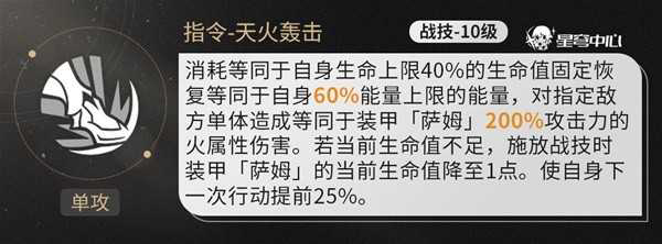 战技可以回复60%能量上限,10级是60%能量上限,所以退出终结技状态后可以两动一大,配合天赋开局一动就能放出大招。释放战技会消耗自身40%的生命值,基础削韧为2对单。流萤释放战技会时会拉条自己25%,有利于减少真空期。