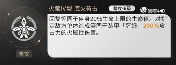 强化普攻削韧为1.5,无法回能,可以回复战技点。和普攻一样仍是对单,倍率中档强普,6级200%。考虑到流萤极低的基础攻击力,所以根本无法打直伤,这个倍率即使是中档也肯定不算高了。强普回复20%生命值上限