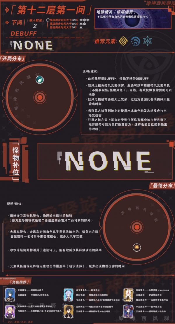 V1.3更新后很多有温迪的小伙伴发现,本来能轻轻松松通过的12-3同样阵容竟然差了将近30S的伤害,我马上去打了几遍发现了问题,本来12-3温迪元素爆发内能比较频繁出现的白色摔伤数字现在几乎一下都出不来,这对旅行者们的练度提出了比较大的挑战(但也比11层简单吧2333)。