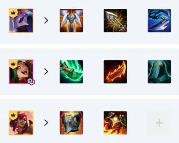 开局装备最好能够拿到女神泪或者反曲弓,因为我们要给金克斯做青龙刀和羊刀这两件装备。而当前版本这两个装备都是大热门,如果前期能够拿到就是非常舒服的事情了。如果实在是没有那也没有关系,我们可以拿锁子甲或者腰带做出日炎,拿大剑给烬做装备也是可以的。