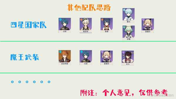 国家队完美的诠释了这个游戏的核心是元素反应。哦,不对,是增幅反应。队伍里没有主C,全是副C打伤害。基本一个人放两个技能,大招就又好了,所以能一直开大一直打反应。国家队集合了这个游戏里目前最顶尖的副C跟增伤,所以打起来会意外的快。然后又因为有多中属性的角色,所以破盾基本也不是问题。但不得不说的是,国家队确实很强,但同时也占据了这个游戏里几个神级辅助和副C。这让其他五星主C只能眼巴巴的看着,导致另外一队不好配队。而且国家队要求副C的练度都得很高,所以还是推荐拆开比较划算。
