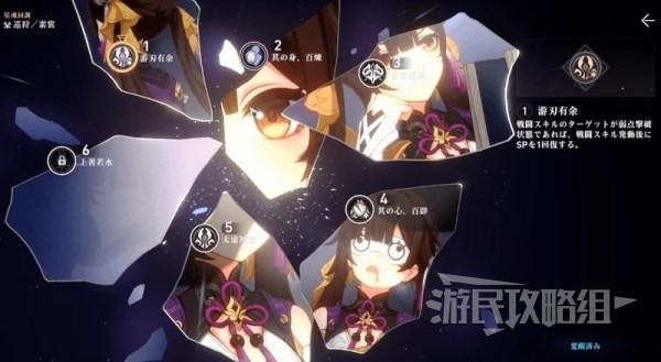 以《原神》类比的话,行迹相当于技能,但包含了一些纯属性方面的提升,并且是以树状结构显示的。提升行迹等级可以提升技能倍率或获得附加效果。用于提升附加效果的素材每周获取数量是有限的(相当于原神中的周本BOSS掉落素材),需要慎重考虑。