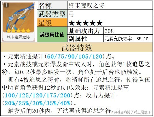终末嗟叹之诗是辅助神器,同样和适合夜兰,是夜兰的最优选择之一。副属性55.1%的元素充能效率可以让夜兰的充能更好毕业;被动很好触发,精1就可以给全队带来100点元素精通,以及20%的攻击力加成。