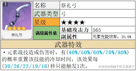 西风猎弓和祭礼弓各有优势:西风可以给全队回能;祭礼则是重置E技能CD,能让0命夜兰体验一下1命的感觉,进一步降低充能要求。不过西风弓是低白值高副属性,副属性有着高达61.3%的元素充能效率;祭礼弓则是相反。综合来说,西风弓的优先级是要高于低精炼祭礼弓的,和高精祭礼弓地位差不多。