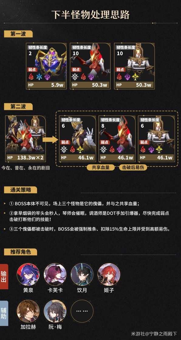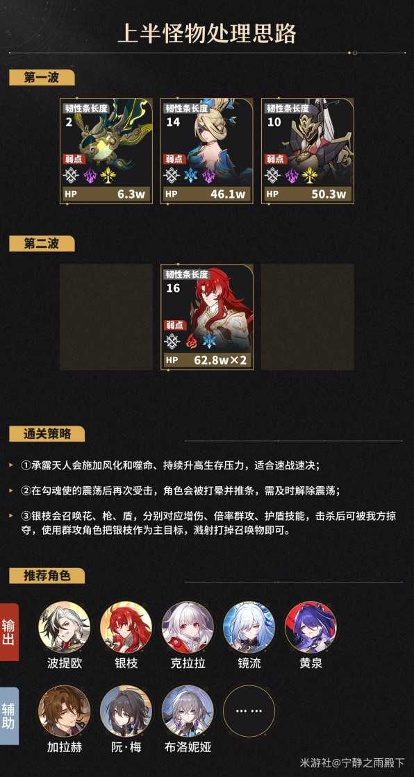 推荐队伍: 黄泉/高练度姬子,或者使用DOT队 /饮月 /银枝,不过后者由于弱点属性覆盖不全,需强杀或酌情带加拉赫等可补削韧的辅助位。