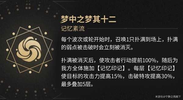 · 当扑满被击杀时攻击者立即立即行动提前100%,随后为我方全体施加记忆印记;
