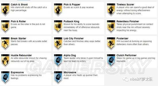 徽章方面,他拥有3个投篮金章(接球投篮手、挡拆投篮手、坚韧得分手)、3个内线金章(掩护达人、补篮之王、强力终结者)、1个组织金章(快攻发起者)、2个运动能力金章(隔扣达人、空接达人)和1个精英篮板手,从徽章类型也可看出这名球员的全面性。