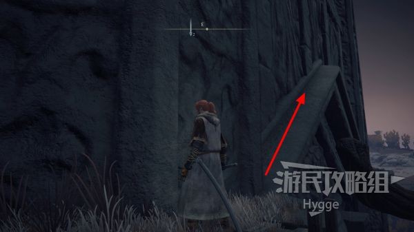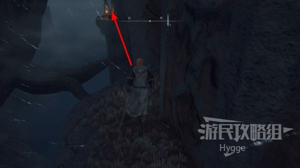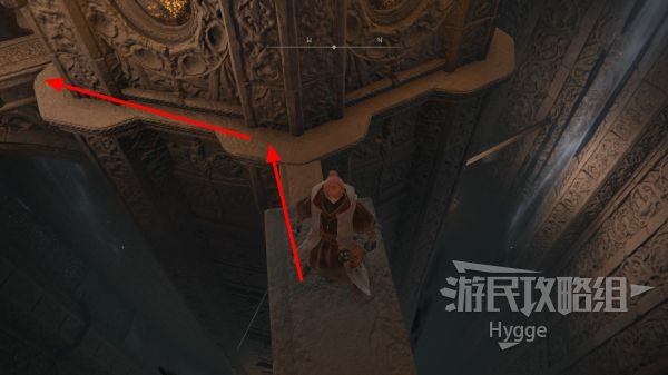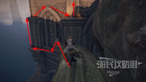 来到盖利德神授塔底部后,通过旁边的树干到达神授塔边缘,随后沿下图所示线路向上。