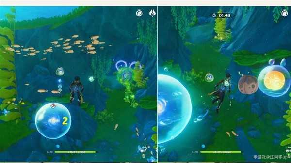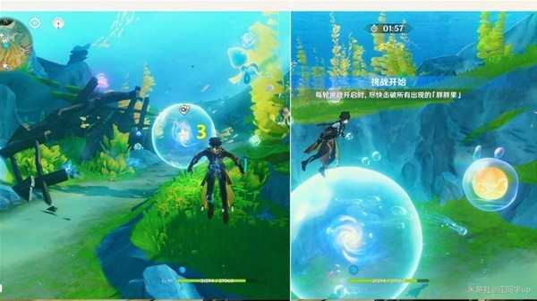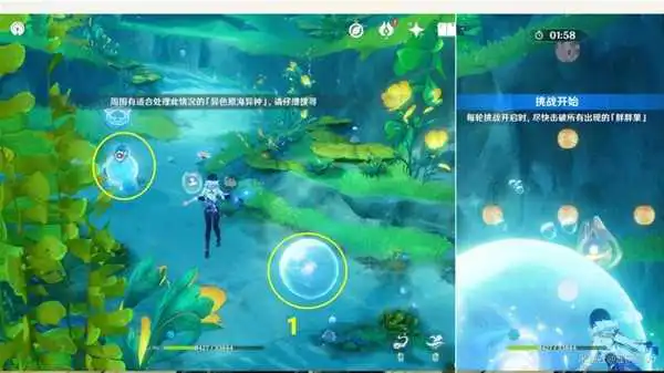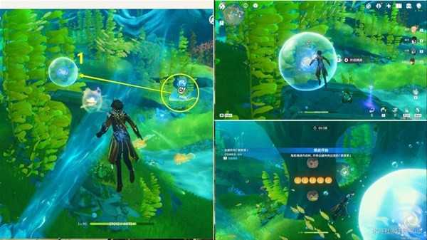 (1)到1能量球位置后,先获得旁边【水母炸弹能力】,然后靠近1能量球开启挑战,接着打完【胖胖果】挑战后,即可拾取1能量球了