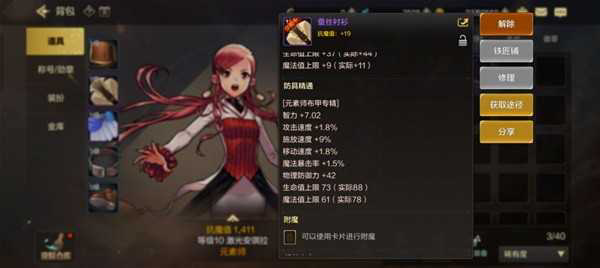 当玩家们转职元素师之后会获得布甲专精技能,穿戴布甲会获得额外的智力、三速、魔法暴击率、物理防御、生命值魔法值上限。