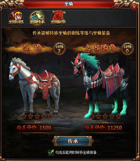 热血三国3坐骑传承不仅可以传承坐骑的训练等级,还可以传承坐骑的装备。坐骑传承的规则是只能由高等级传承给低等级。