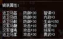 这里先给大家列举一下热血三国3近卫马装的属性。左半边,即马盔、马铠、马鞍,主要加的是防御;右半边,即马鞭、缰绳、马掌,主要加的是攻击。
