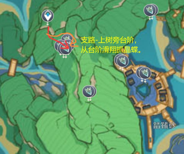 攻略会根据晶蝶的[聚集数量及密度]、[与最近锚点距离]、[周边地形]、[怪物干扰]等多方面过滤晶蝶窝点,剔除掉多数跑图麻烦的散布点,将余下的所有高价值晶蝶窝点逐一列出,每一处晶蝶窝点各配若干张世界8的地形图和部分实景图(由于晶蝶会不断变换位置,故此仅标注大致的推荐路线)。