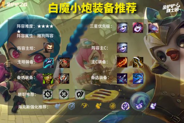 这套阵容还是非常吃海克斯强化的,如果前期能够有羽量级选手一定要去拿,如果开局是彩色羽量级选手可以直接不用做羊刀,再给小炮补充一个输出装即可。其次像狙神转职可以给发条,补充女枪开4狙,白魔法师转职能够直接补充5白魔法师,都是非常不错的选择。