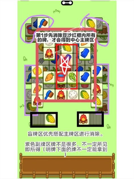 1、图一把大的框架和最后主牌区都给大家标出来了,我们就直接略过紫色副牌区开始消除所有可以看到的牌。