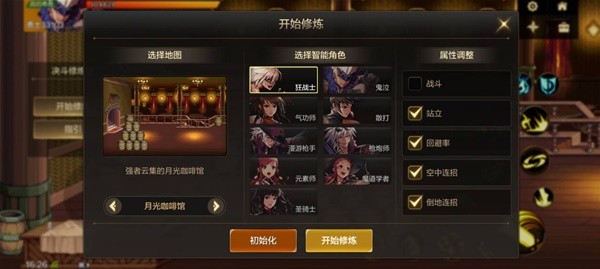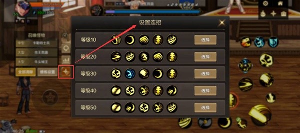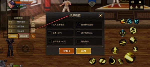 为了更方便地进行修炼,【全部清除】按钮则怪物直接消失,【修炼设置】按钮后可设定“提升攻击速度”、“提升移动速度”、“百分百暴击”、“百分百命中”、“所有几率百分百”和“怪物战斗”六种模式,最大化修炼的成果。
