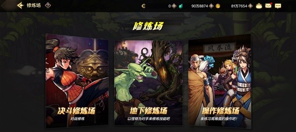 角色达到16级后,【对战】功能开启,主页面右侧的【对战】,选择【修炼场】后,可以选择地下修炼场、决斗修炼场或操作修练场。