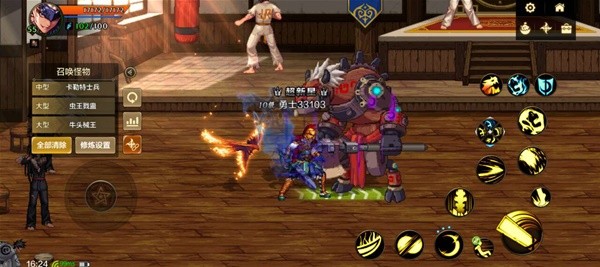 其中,地下城修练场的对战对象是怪物,其中小型怪物的代表是哥布林,中型怪物的代表是卡勒特士兵,大型怪物的代表是牛头械王,无法浮空倒地怪物的代表是虫王戮蛊,对应怪物后即可召唤出来进行对练。
