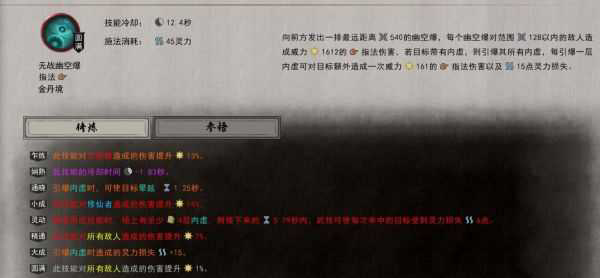绝技用幽空爆,词条必须要有使用此技能后,场上若有X层内虚则接下来x秒内武技可使目标命中的目标灵力损失x点,再来一样最好有减CD、增加引爆内力损失、命中晕眩,其它就还好(我用的还是金丹的,还没有去刷元婴的)