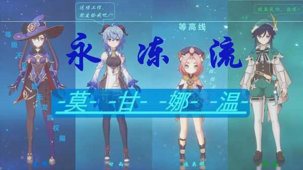 [莫甘娜温] ,即莫娜、甘雨、迪奥娜、温迪,莫娜能够为怪物持续上水,并提供大招增伤;甘雨大招能够为怪物上冰打冻结,并打出不错的伤害;迪奥娜在队伍中主要起回血与充能的作用;温迪大招期间持续高频挂元素,并利用天赋为相对应角色充能。