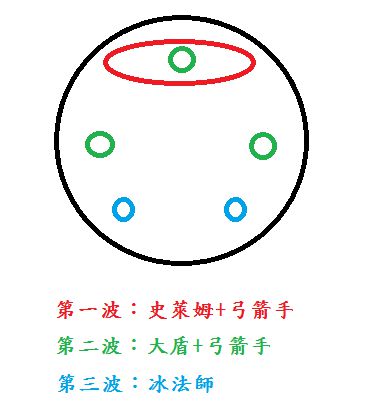 第一波,出口侧左右两只弓箭手,中间一只带「冰牢」灵气的史莱姆,第一波不废话,中间那只先杀,不只会造成每12秒一次的冰牢,他打守护点也最痛,不理他他等一下就给你打个1X%掉,亏都亏死你,左右两只每箭只打1%左右,可以先不管。阿如果有聚怪,直接朝着中间史莱姆射过去就可以聚起来了。这三只很密集不难处里。