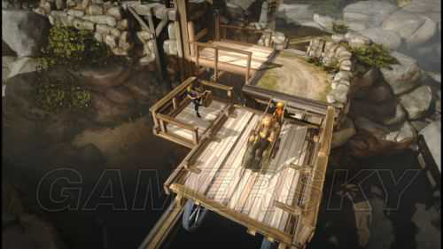 step2.继续让哥哥走到车尾处(按LT键)推动车子,将手推车推至木制升降机内,然后哥哥、弟弟(松开LT、RT键)走到右侧的峭壁(断裂绳梯)前,哥哥(按LT键)做好“垫脚石”的姿势,弟弟走到哥哥面前(按RT键)踩上哥哥的手腕跳上小山。