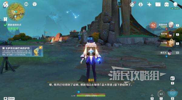 完成世界任务【迷林之子】、【火中取梦的故事】、【群山的影子】后,将游戏内时间调整至两天后,传送万火之瓯七天神像左上方传送锚点,从传送锚点跳到下方地面上,在附近逛一逛会找到一个名为???的NPC,靠近后会强制触发对话(对话期间得知此NPC名叫曼科),对话后即可接取此任务,注意此NPC会在多个位置随机出现,在跑图时很可能会强制对话,建议先打开任务追踪查看是否已经接取了【勇敢者的仪式】任务,如果没有再一边跑图一边寻找此NPC。