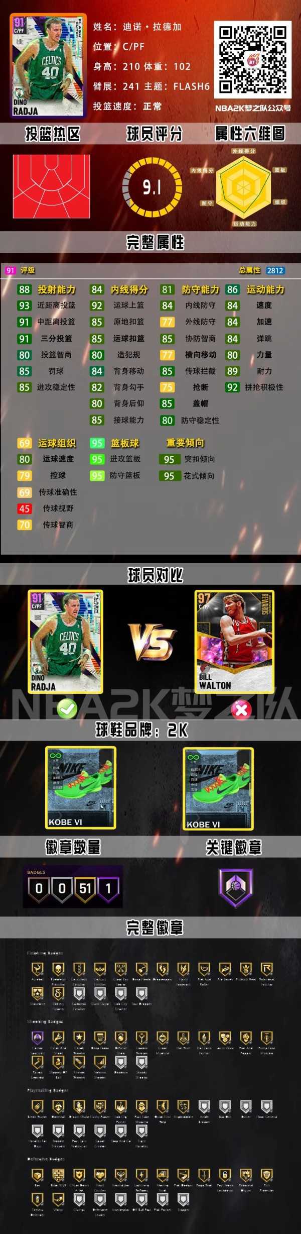 笔者一直推崇备至的超级妖人拉德加,这次虽然只是一张紫卡,但却打上了【故障】标签,而他“魔改”的地方则是大家最爱的三分球,其三分属性高达91,热区也是直接拉满!再加上堪称2K第一臂展的建模优势,使得这张卡绝对可以成为线上比赛的常客。徽章方面,虽然只有一枚底角专家紫章,但多达51枚金章也算是相当不错了,球鞋依然首推三速型科6,可以将其速度拉到90左右,“飞奔的长臂猿”就是他了!