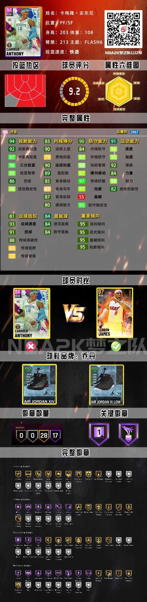 甜到掉牙的掘金瓜来了,虽然安东尼的防守在职业生涯中一直不算优秀,但因为【故障】的原因这卡的防守也被直接拉满,同时他的投射和运动能力也是顶级的存在,可以让玩家体验一把攻守兼备的超级瓜。不过这张卡的徽章却有着明显缺陷,尤其是一枚终结紫章都没有,会使其在内线的杀伤力大减,而且接球投篮手和远程炮台也都只给到了金色,甚至还没有热区猎手,所以这张粉钻掘金瓜依然不够完美。