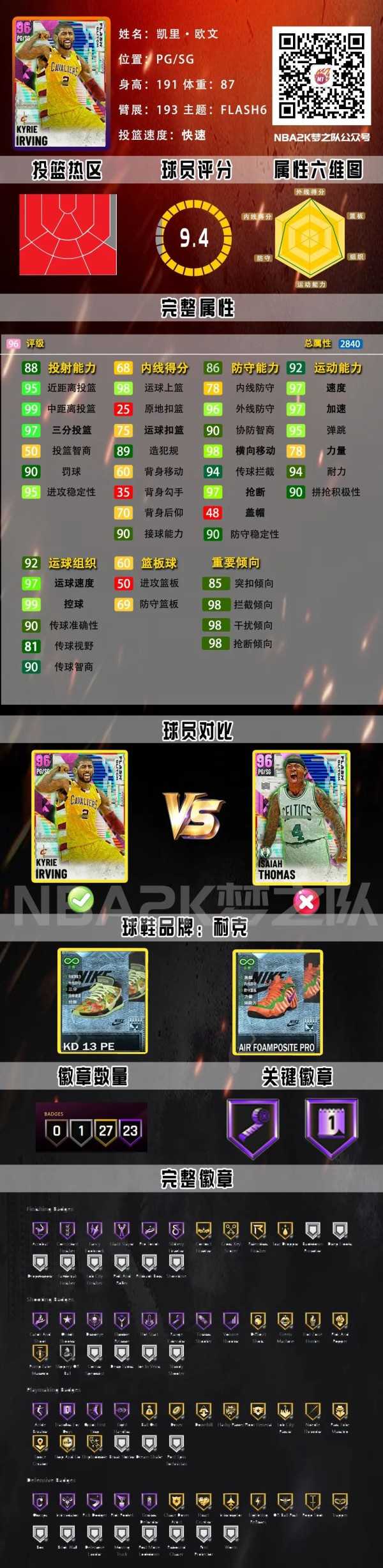 这张粉钻欧文是真香,他【故障】的地方同样是防守,尤其防守倾向非常优秀,同时他的投射要比上面的安东尼还强,其最擅长的控球更是直接拉到了99满分,而且这张卡属性的完美程度甚至达到了三双科6都会溢出的情况,背运包还是最强库里魔术师同款。徽章方面,23紫章比银河大梦还多,自带紫色炮台、脚踝终结者和运球老手,感觉有了这张欧文之后,在线上很受欢迎的小托马斯可以直接进仓库了。