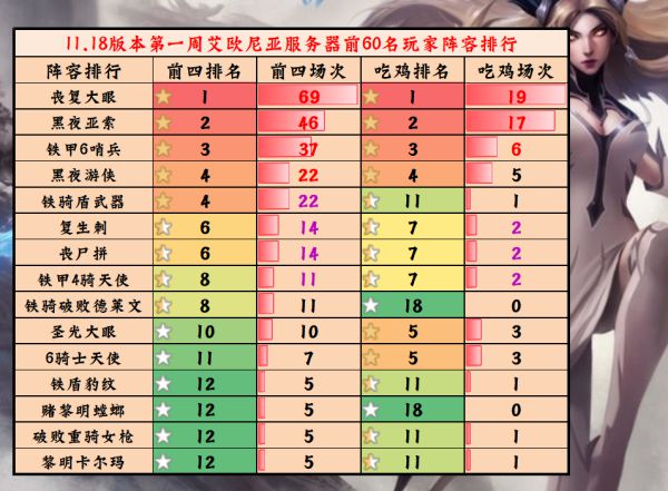 另一个要说的就是德莱文体系,德莱文在更新中增强,出场率与选择率上略有增幅,但对局中还是有许多天使玩家用德莱文来打工,主德莱文玩家比较难2星,导致吃分场次排名偏低,但阵容但破败铁骑德莱文这版本强势崛起。
