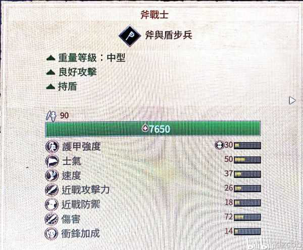 这个部队我建议前期可以多出点,经典的抗线老步兵了,盾很大很厚,总体的体积遮掩的效果非常的好,建议常用。这个部队的维持费用也不高,建议成为中间兵种,下面是他的特质。